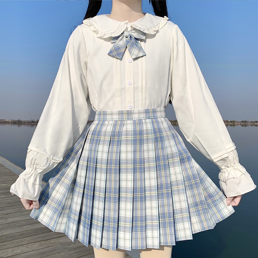 스카이블루 체크 긴팔 프릴 블라우스 세라복 교복세트