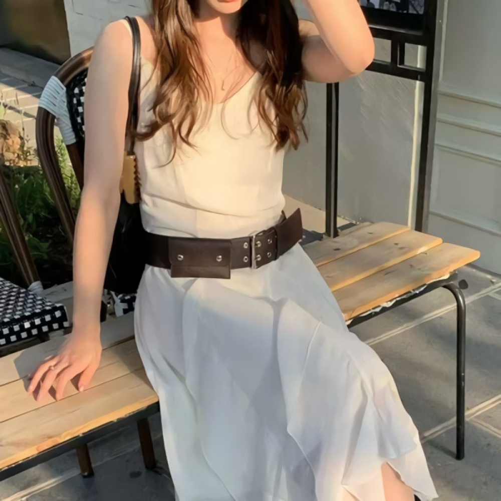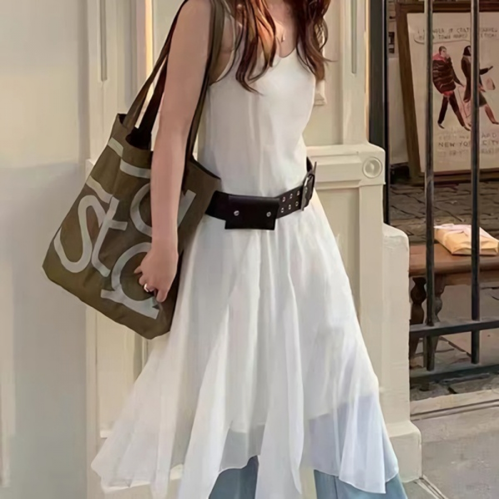 레이어드 사이드 리본 캉캉 끈나시 롱 원피스