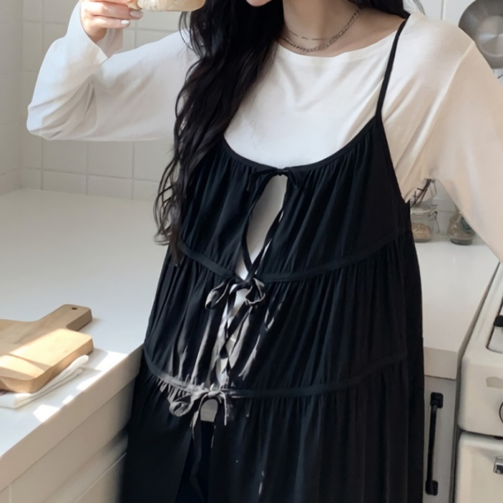 레이어드 사이드 리본 캉캉 끈나시 롱 원피스