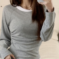 여성 봄 유니크 배색 라운드 롱티셔츠