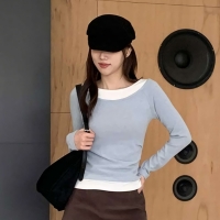여성 언발 배색 레이어드 보트넥 티셔츠