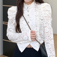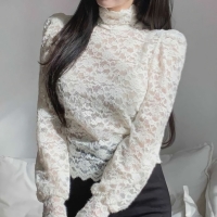 여성 레이스 폴라 퍼프 긴팔 블라우스