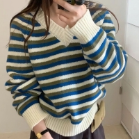 여성 겨울 배색 스트라이프 브이넥 니트