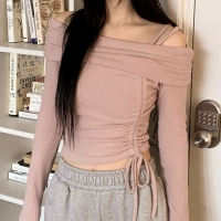 여성 슬림핏 골지 스트랩 오프 니트