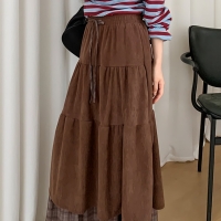 여성 골덴 체크 레이어드 밴딜 롱스커트
