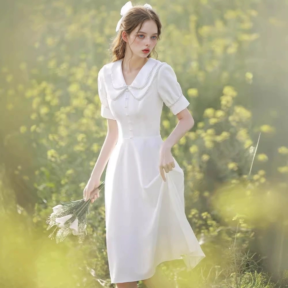 화이트 순백 더블카라 진주버튼 이브닝드레스 웨딩