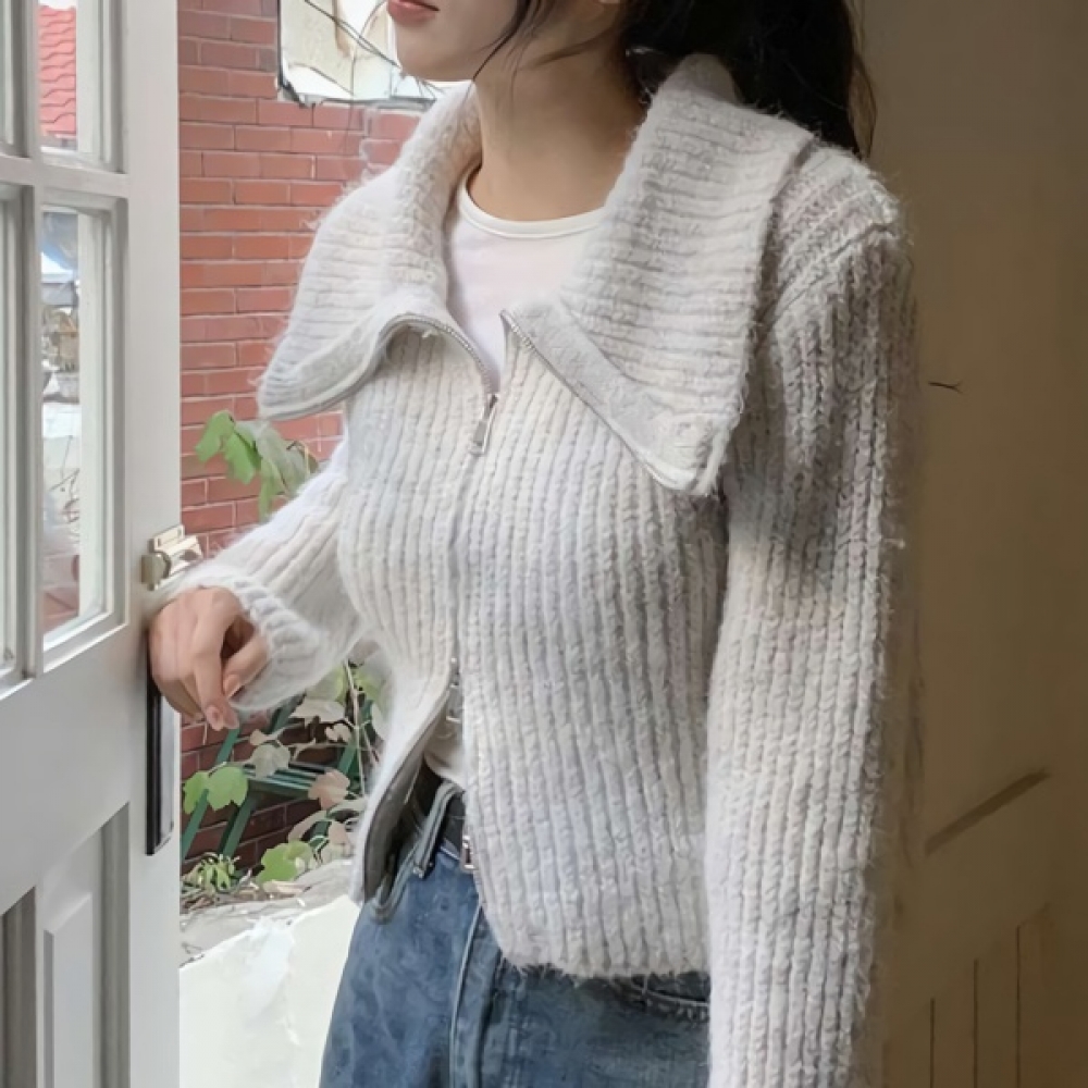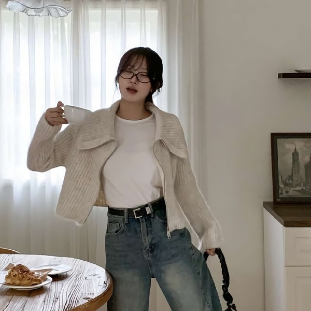 여성 세미크롭 하이넥 울 니트 집업 가디건
