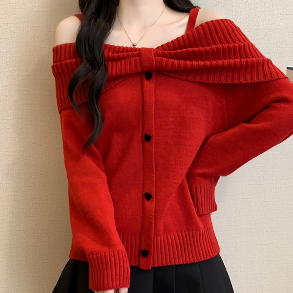 여성 겨울 데일리 오프숄더 리본 레드 니트