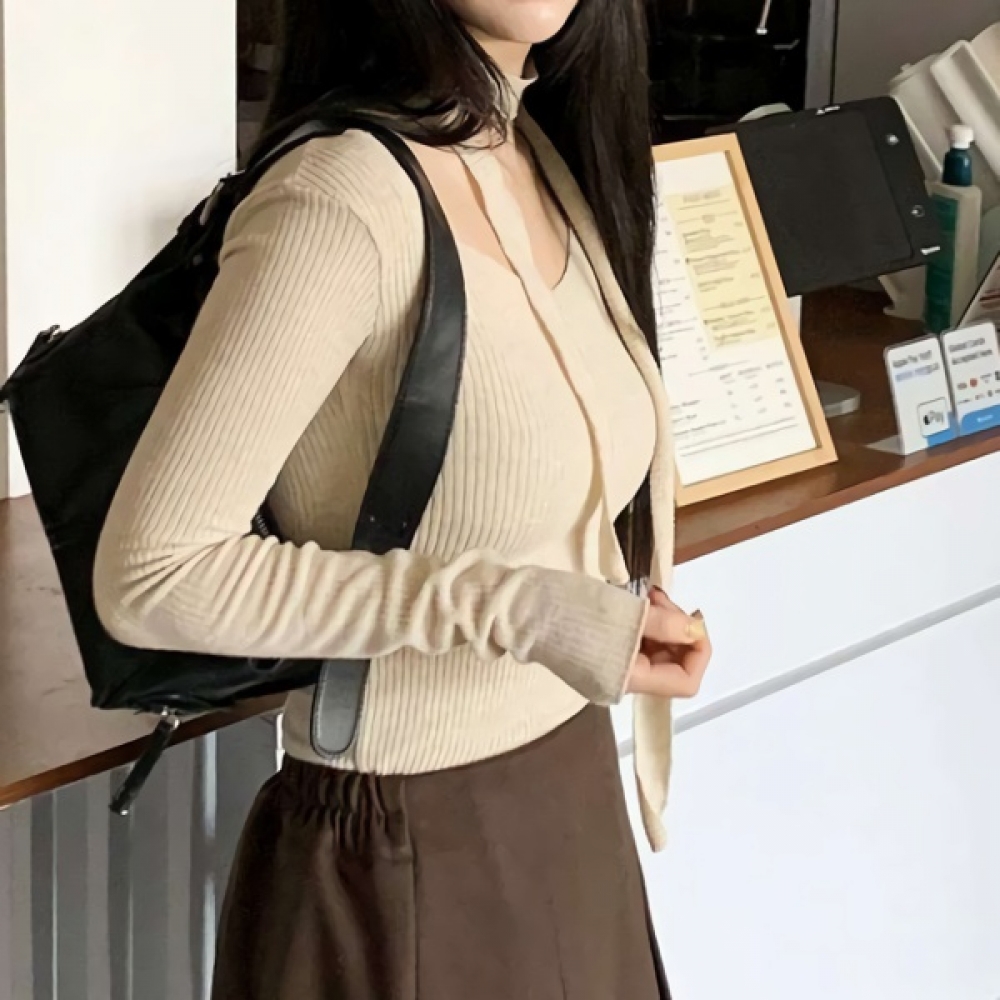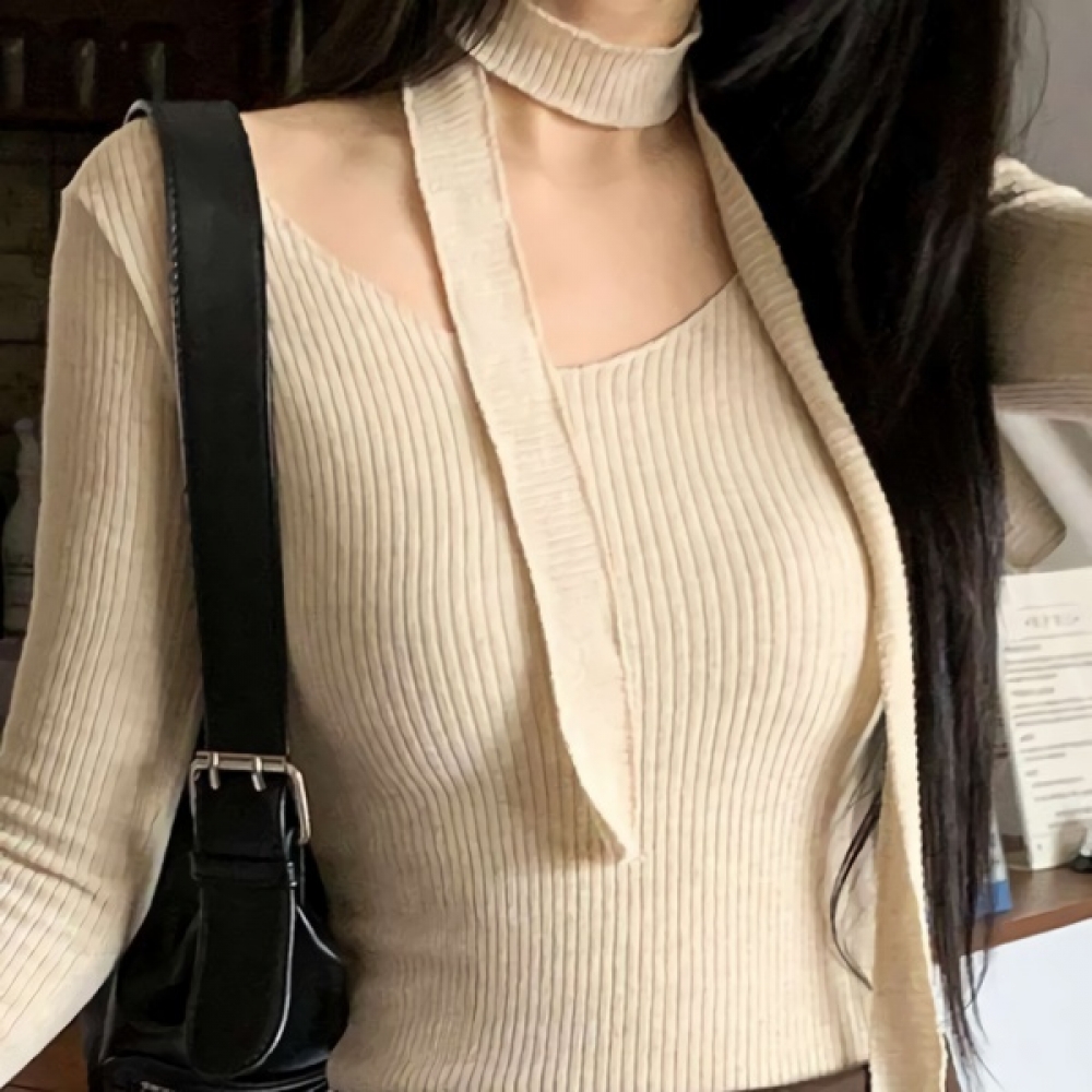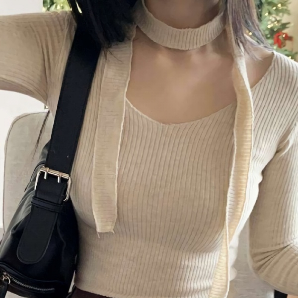 여성 브이넥 슬림 골지 울 니트 머플러 세트