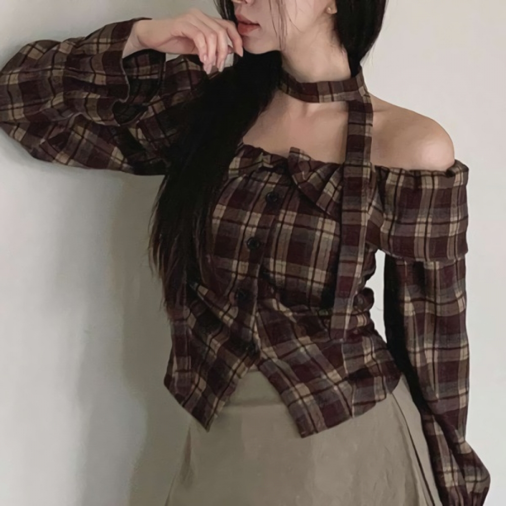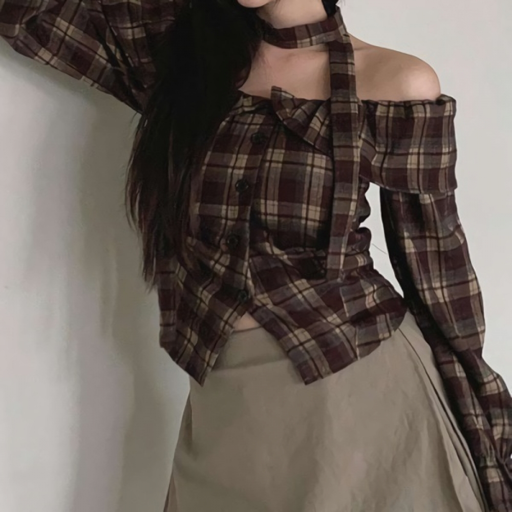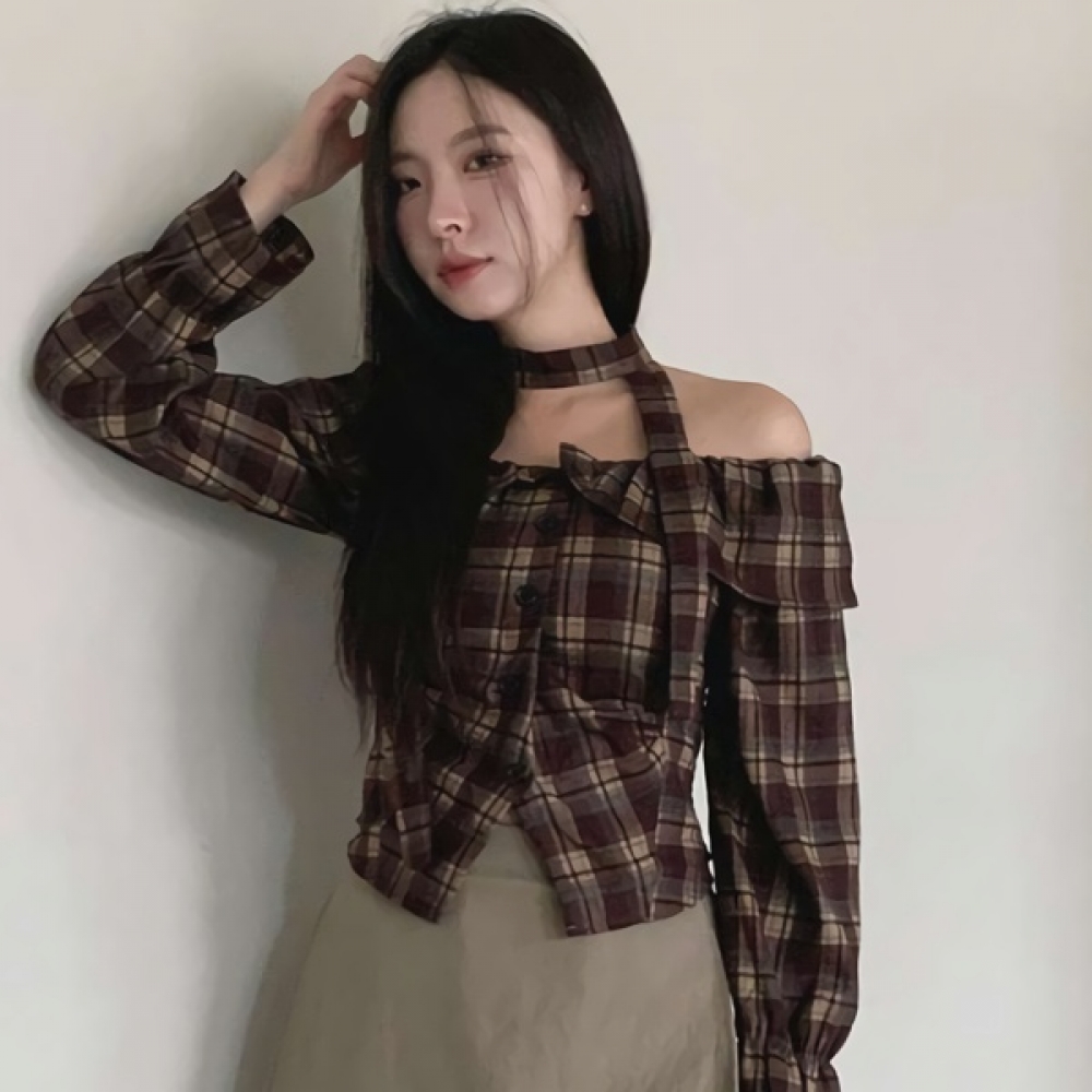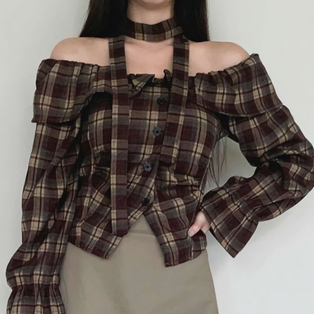 여성 초커 스트랩 오프숄더 체크 블라우스