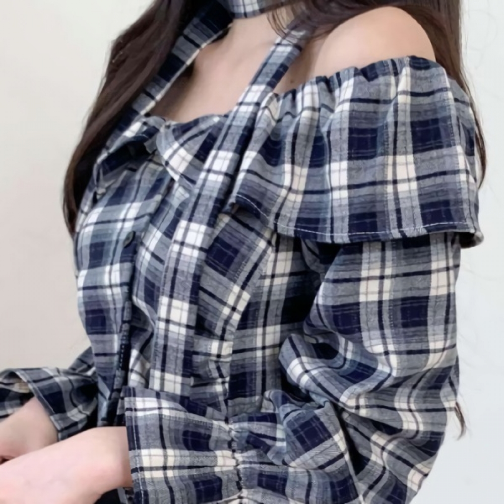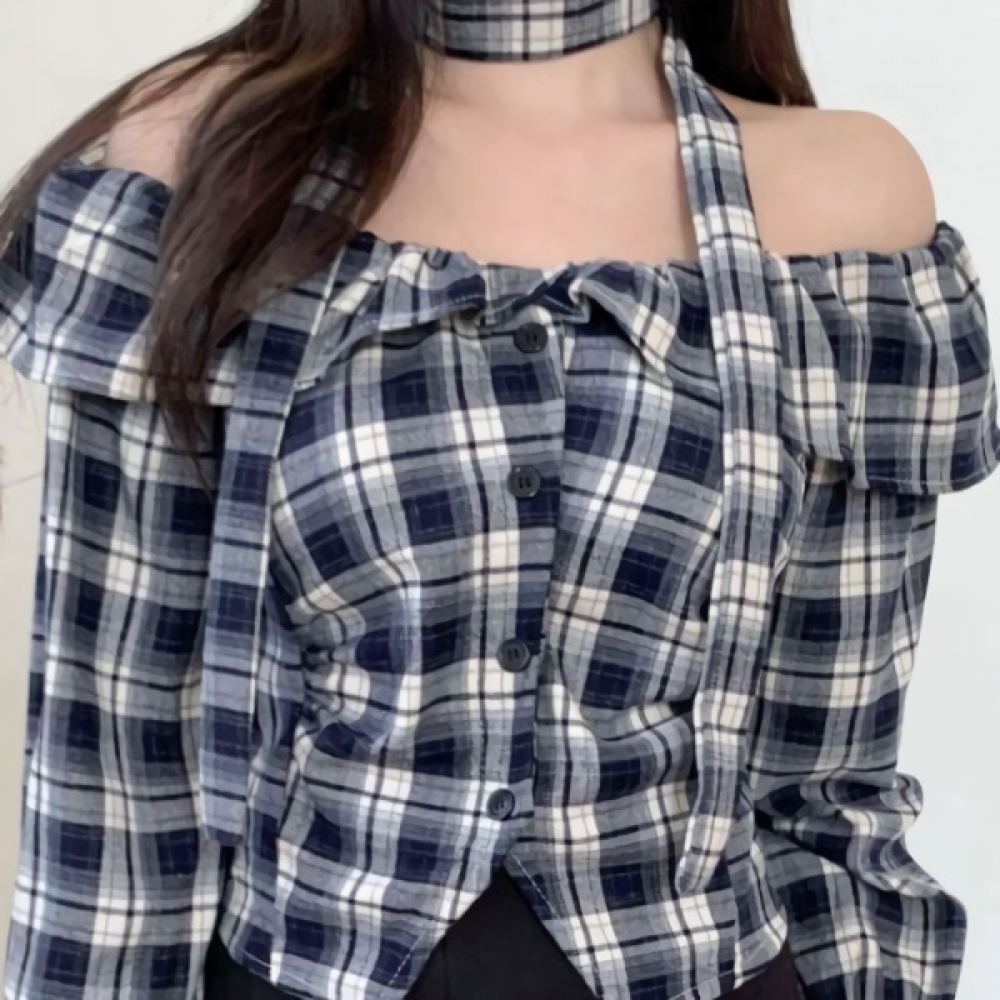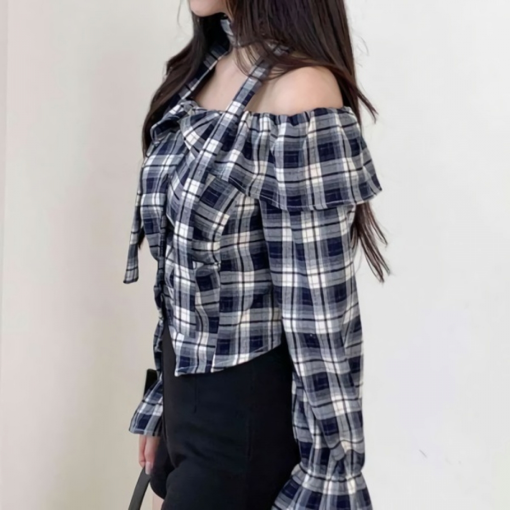 여성 초커 스트랩 오프숄더 체크 블라우스