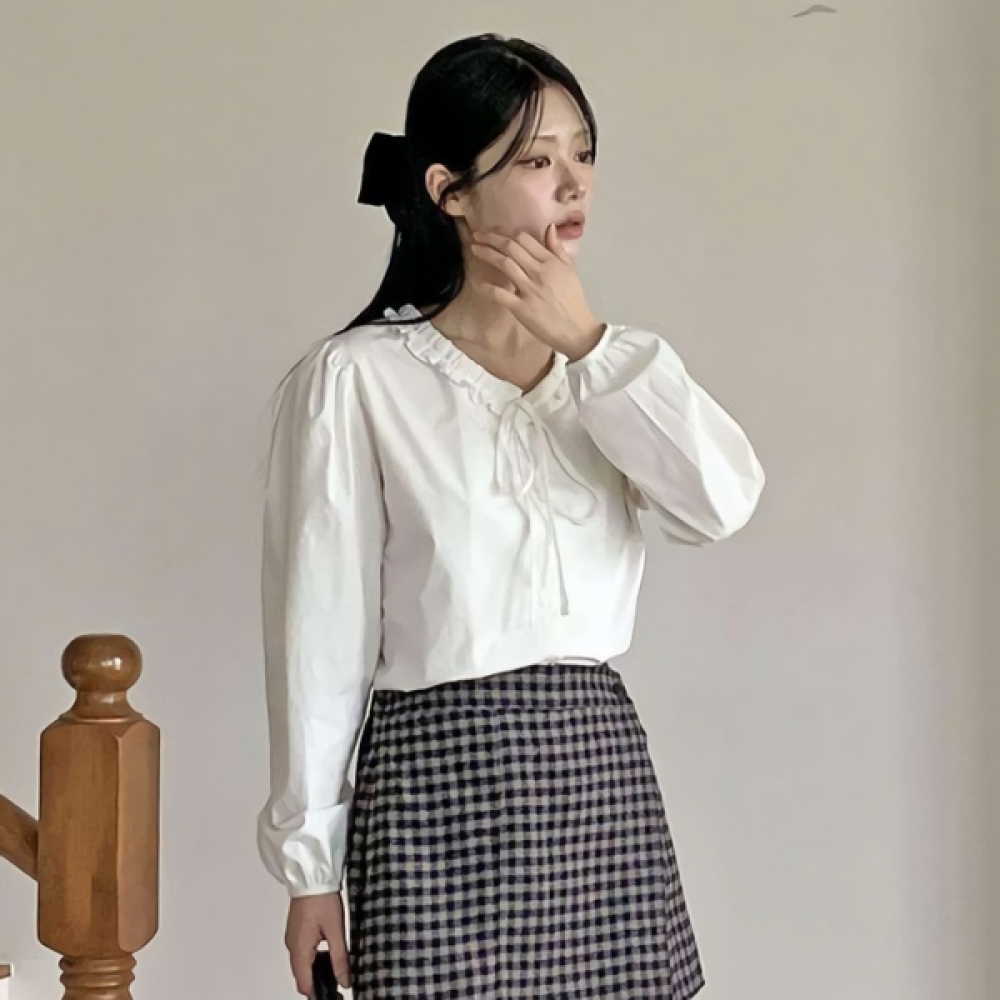 여성 겨울 체크 프릴 크롭 초커 블라우스