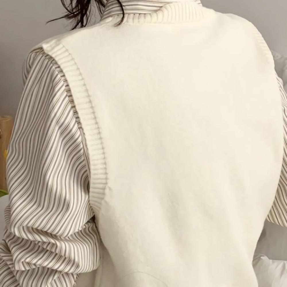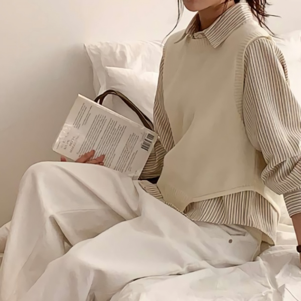 여성 레이어드 니트 조끼 줄지 셔츠 세트