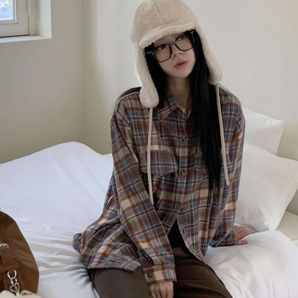 여성 피치기모 루즈핏 체크 포켓 셔츠