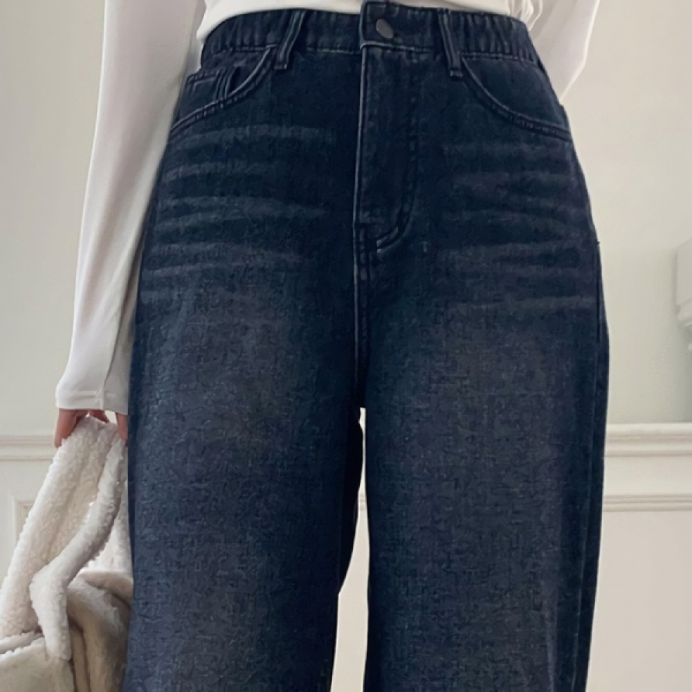 여성 와이드 워싱 기모 밴딩 데님 팬츠