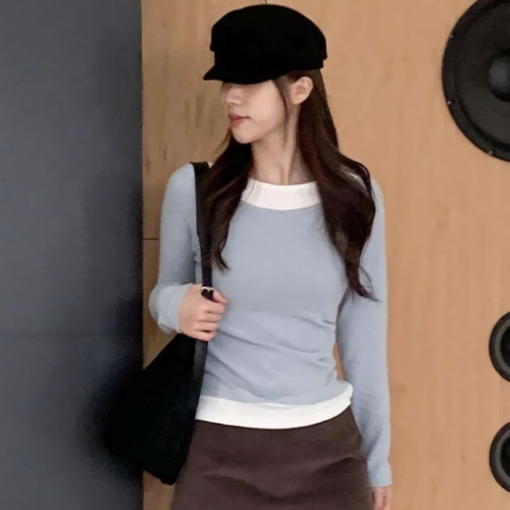 여성 언발 배색 레이어드 보트넥 티셔츠
