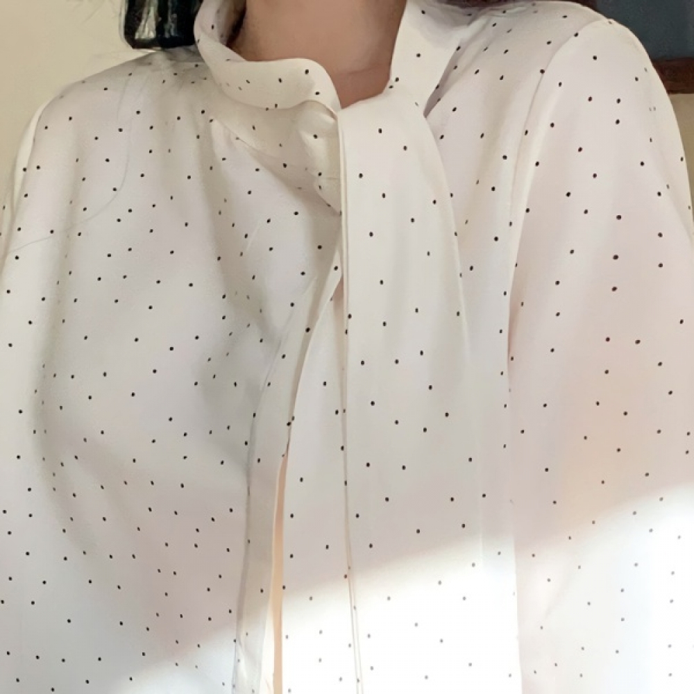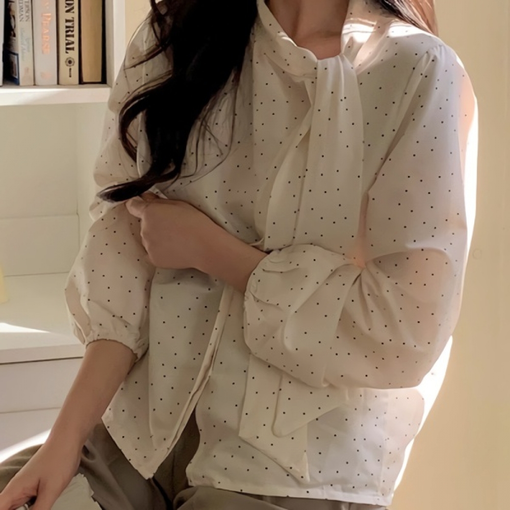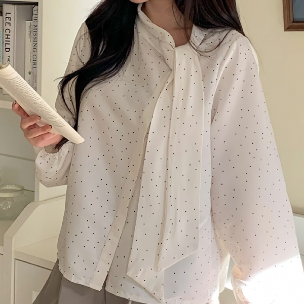 여성 페미닌 루즈핏 도트 타이 블라우스