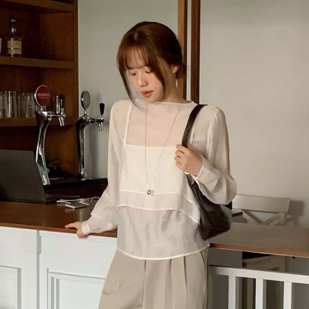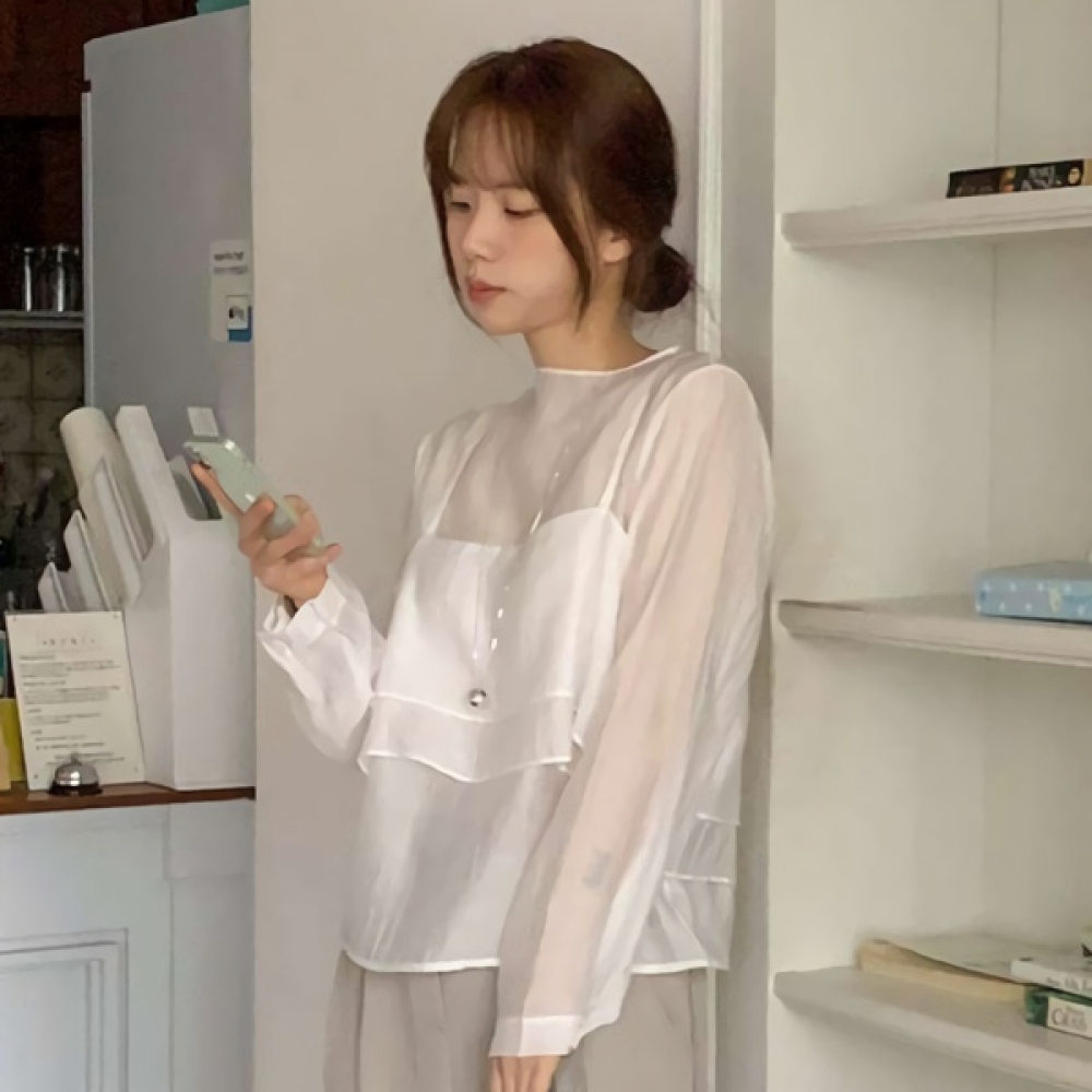 버튼 프릴 나시 뷔스티에 시스루 블라우스 세트