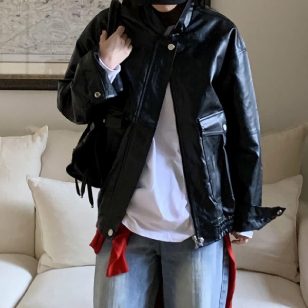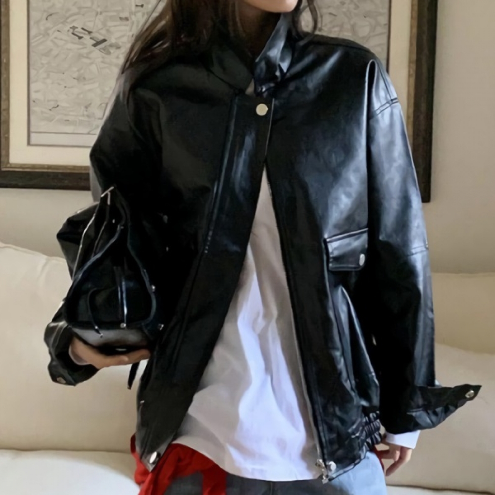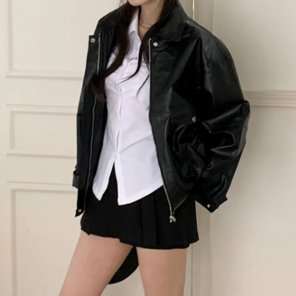 여성 오버핏 카라 하프 레더 가죽 자켓