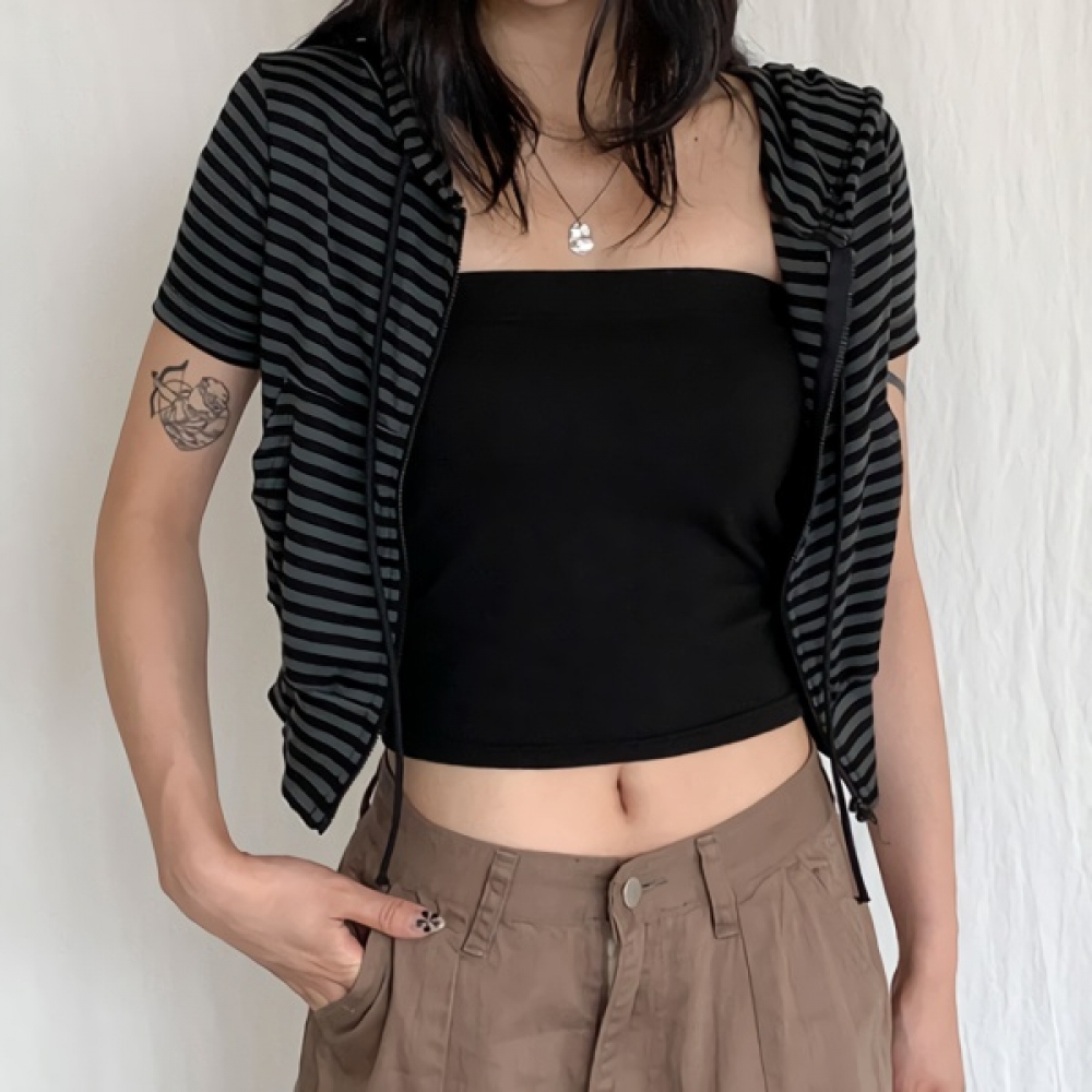 여성 스트라이프 반팔 크롭 후드집업
