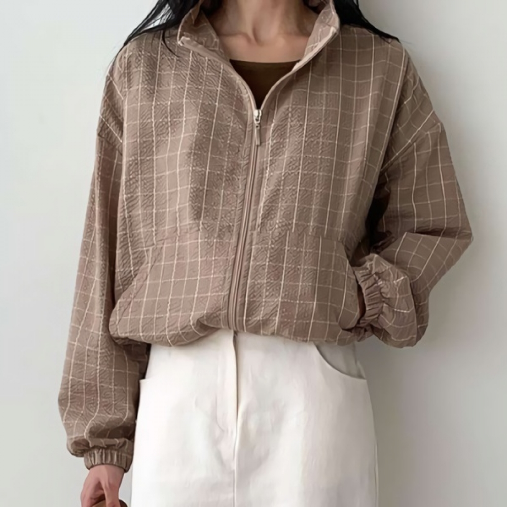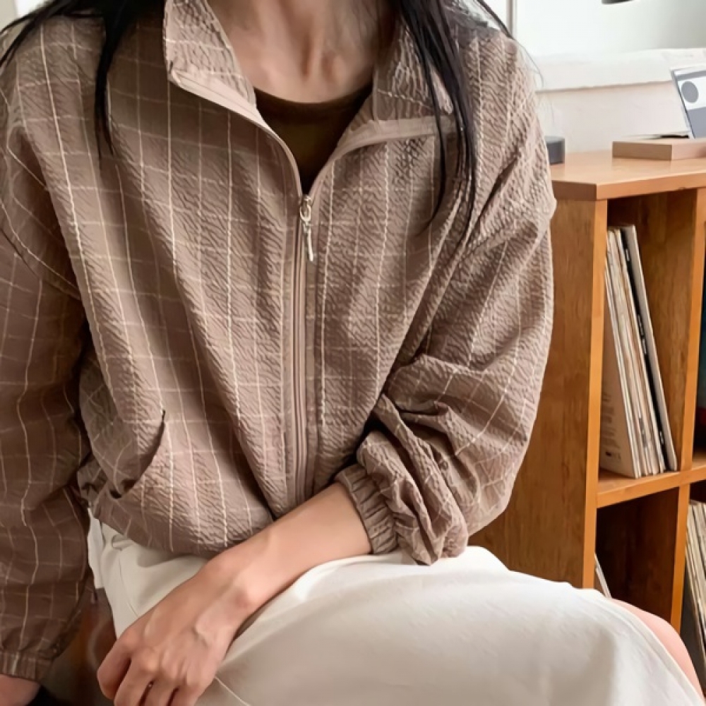 여성 하이넥 체크 스트링 크롭 집업