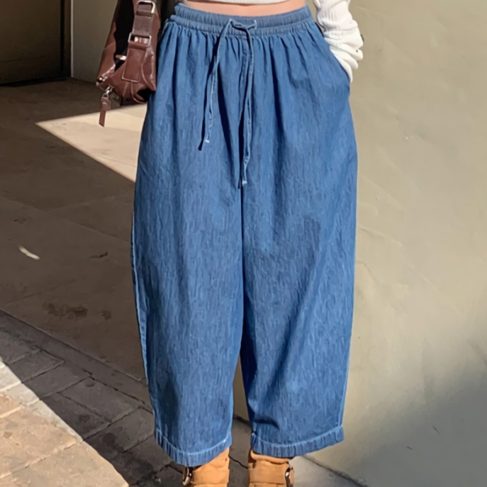 여성 테이퍼드 다트 배기 커브드 데님 팬츠