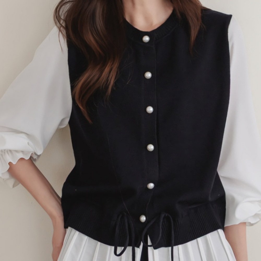 여성 셔츠 배색 밑단 플리츠 니트 가디건