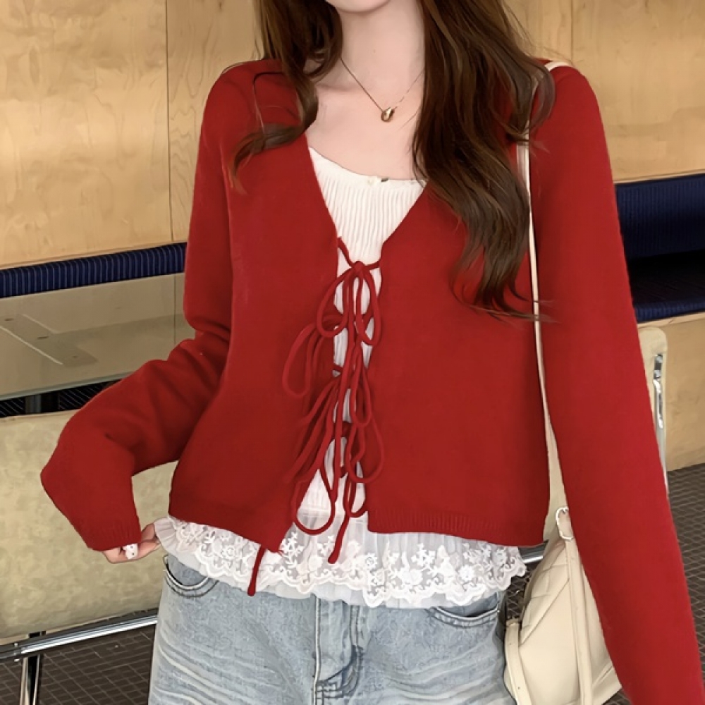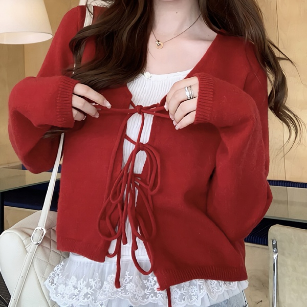 여성 봄 데일리 레드 스트링 크롭 가디건