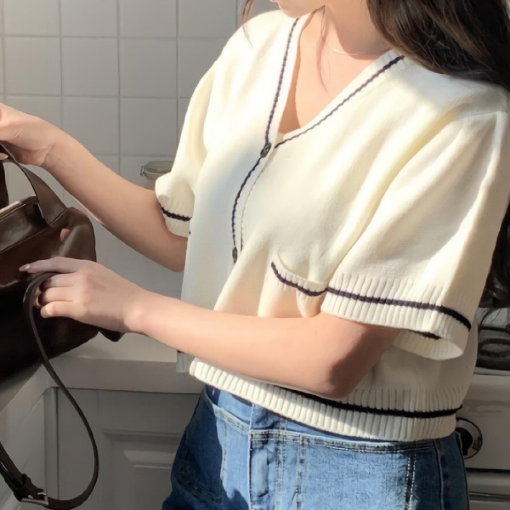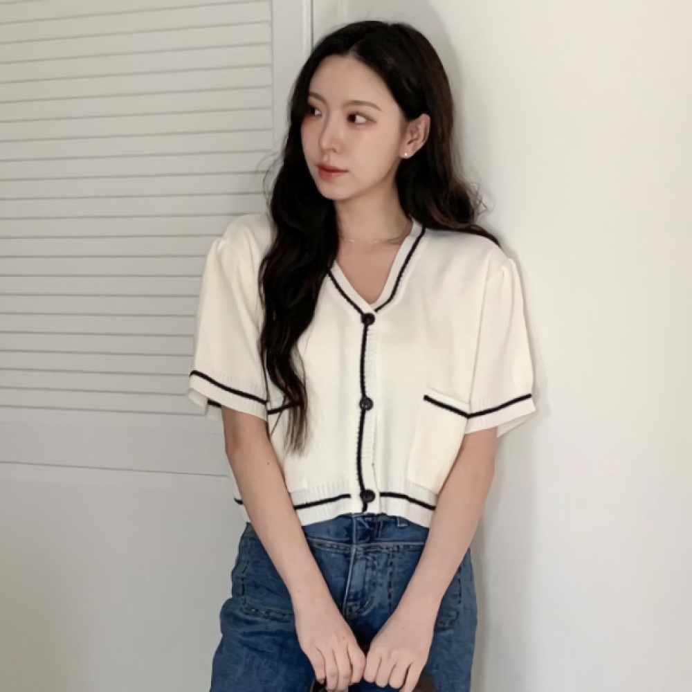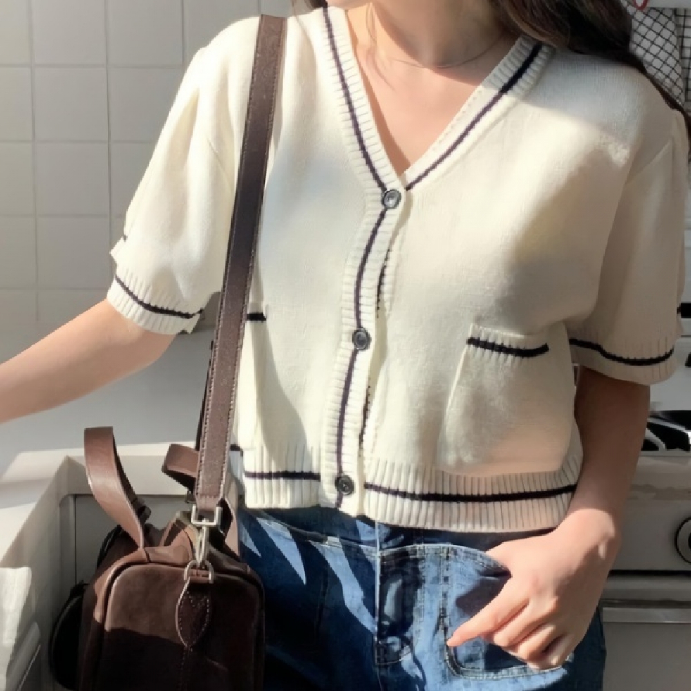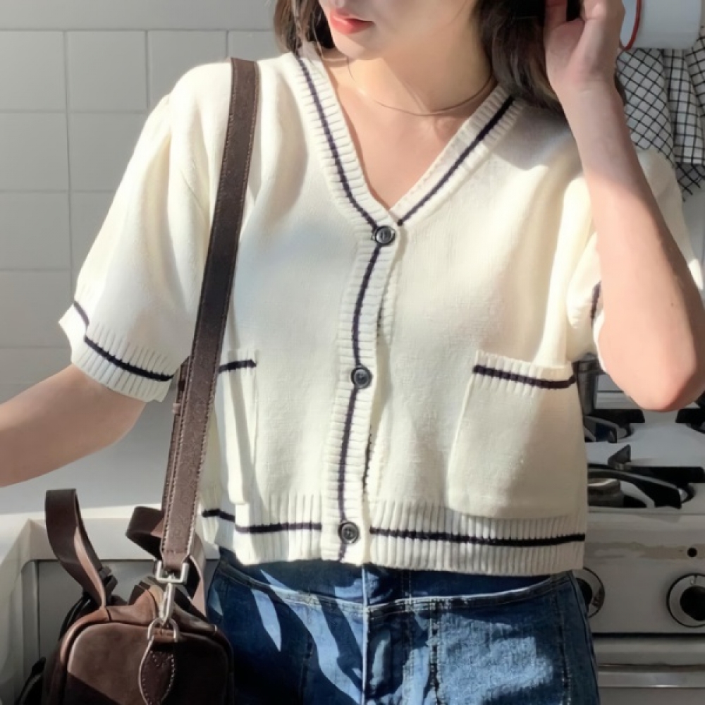 여성 봄 브이넥 포켓 배색 반팔 가디건