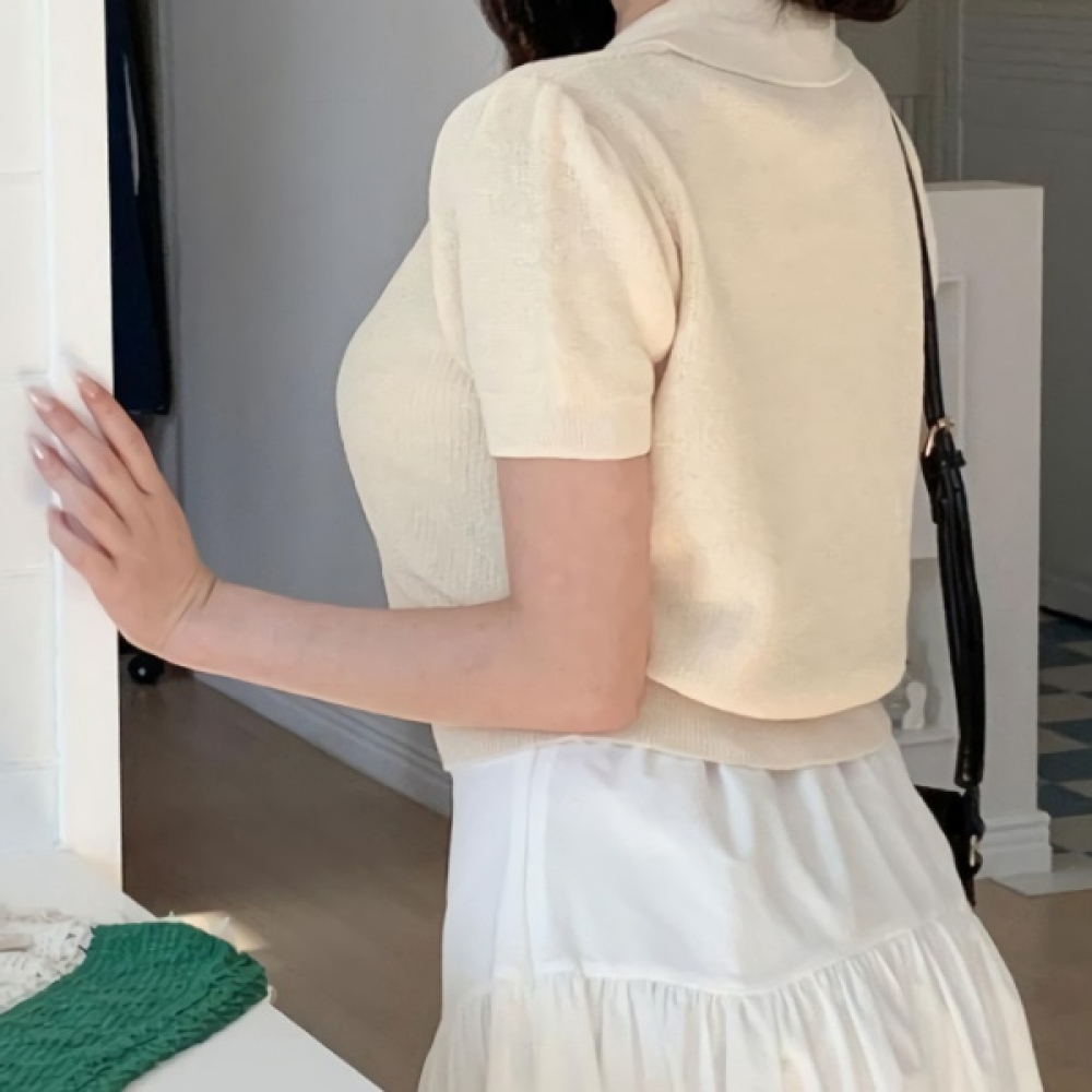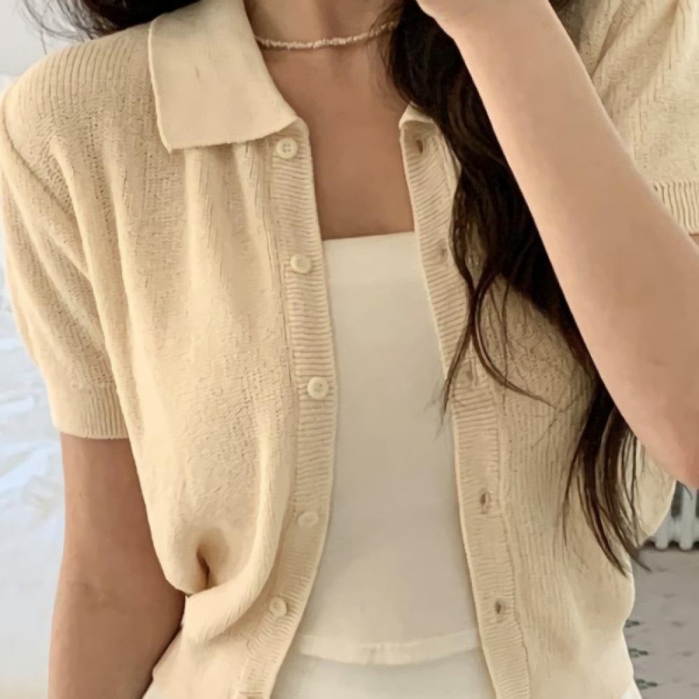 여성 봄 데일리 퍼프 소매 카라 니트 가디건