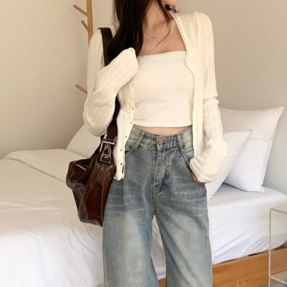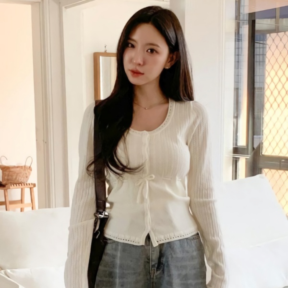 여성 봄 슬림핏 유넥 펀칭 가디건