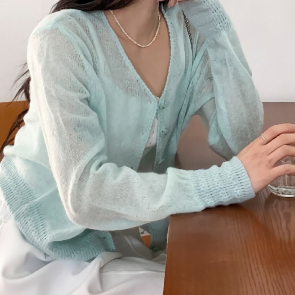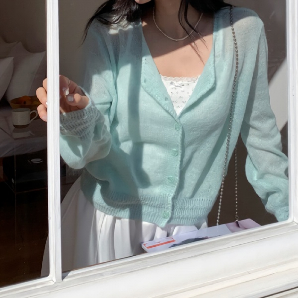 여성 봄 스카시 펀칭 반팔 니트 가디건
