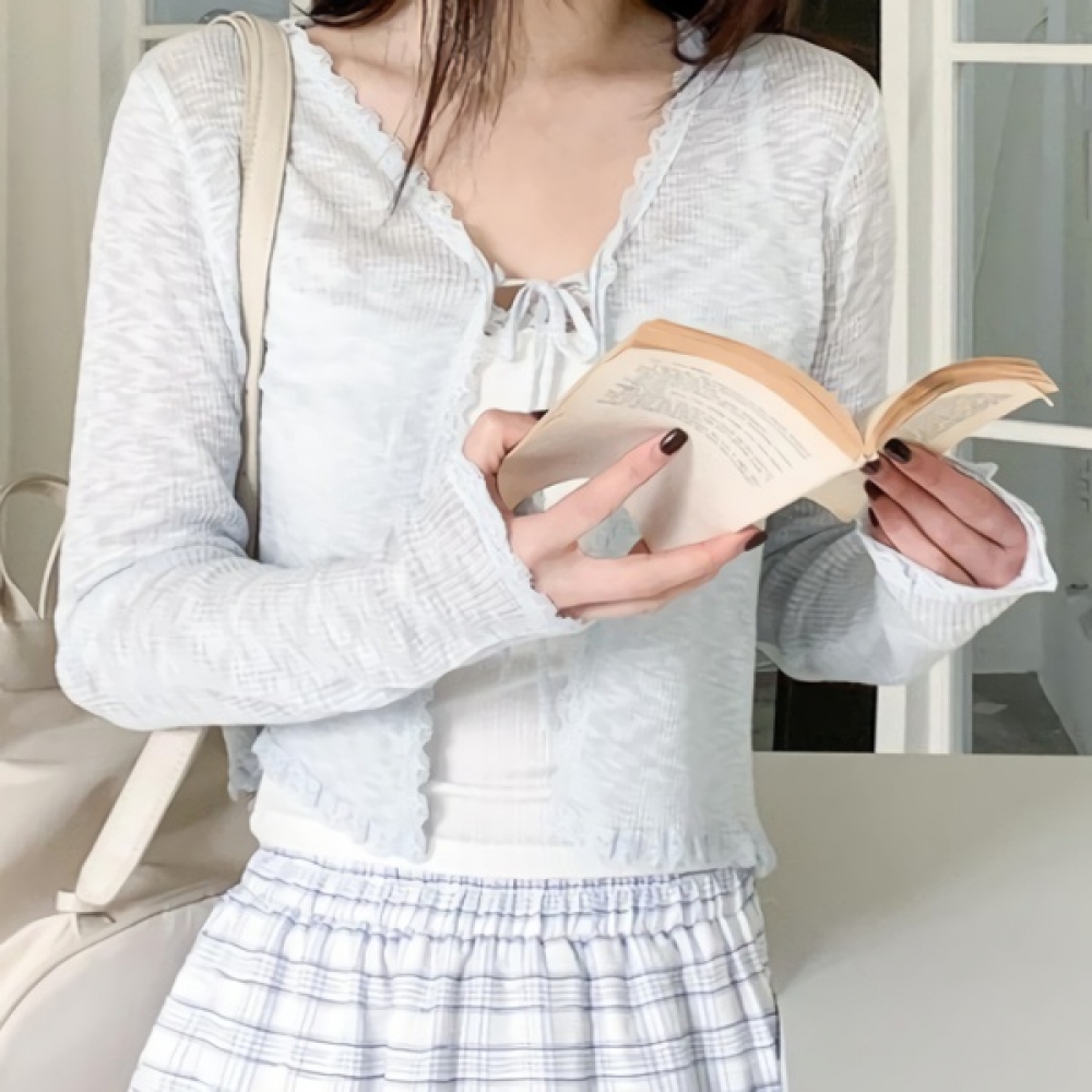 여성 브이넥 레이스 스트랩 크롭 가디건