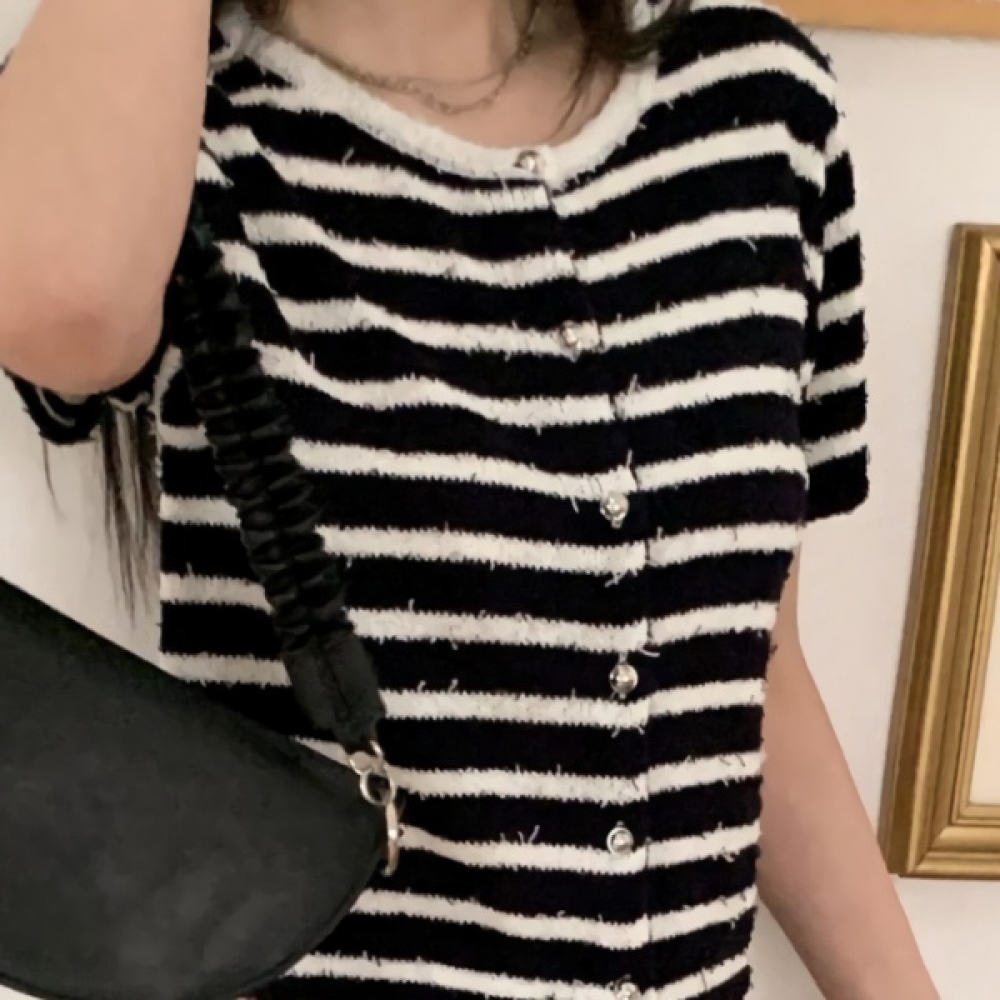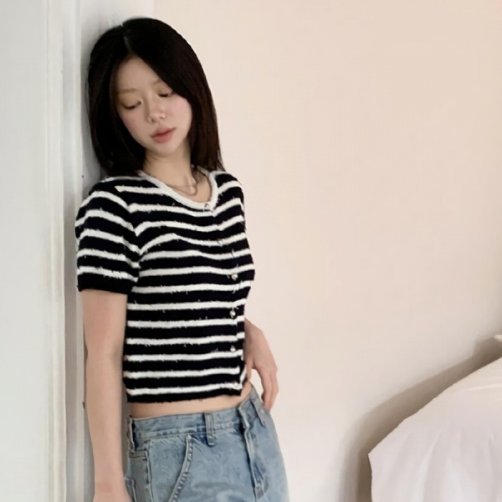 여성 부클 스트라이프 반팔 니트 가디건