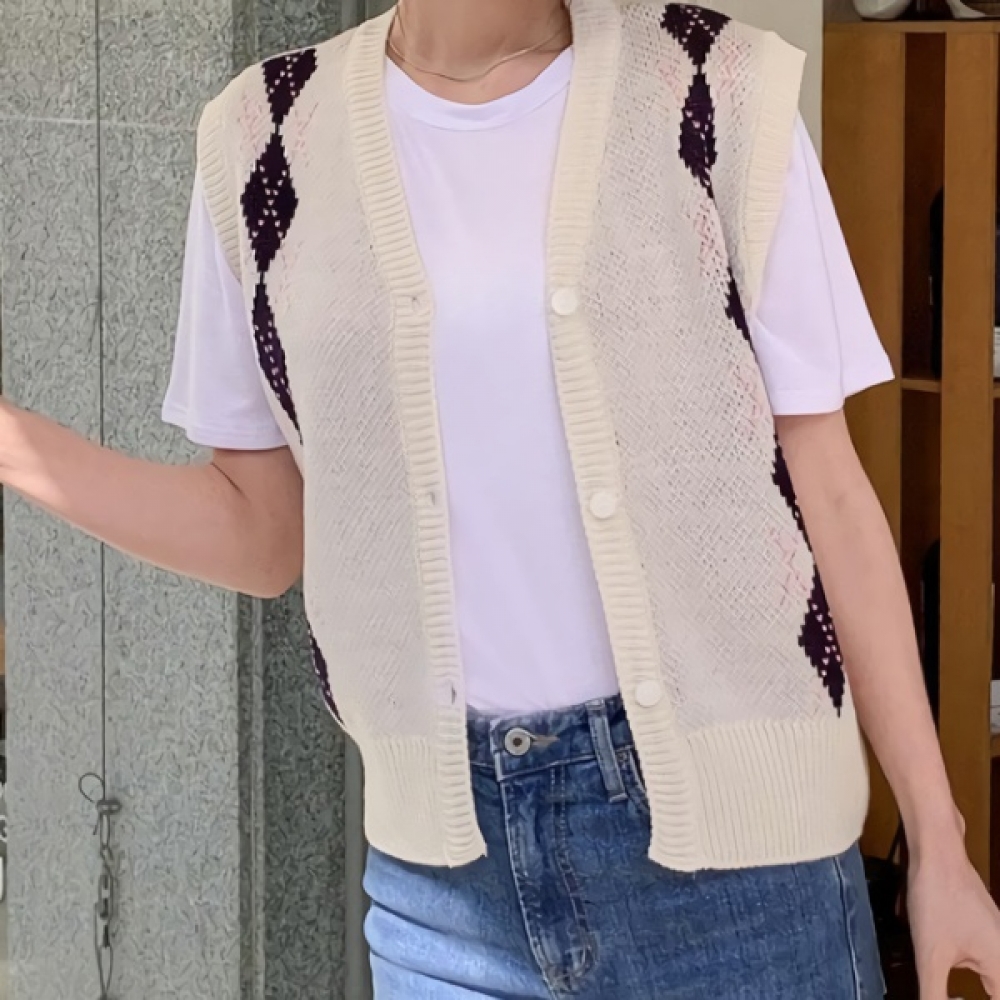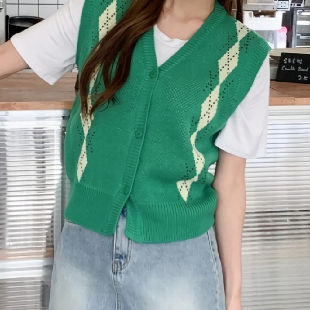 여성 봄 브이넥 아가일 니트 베스트