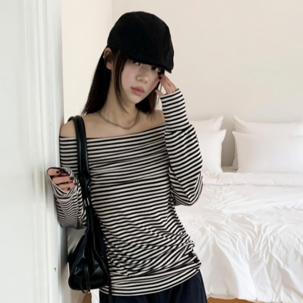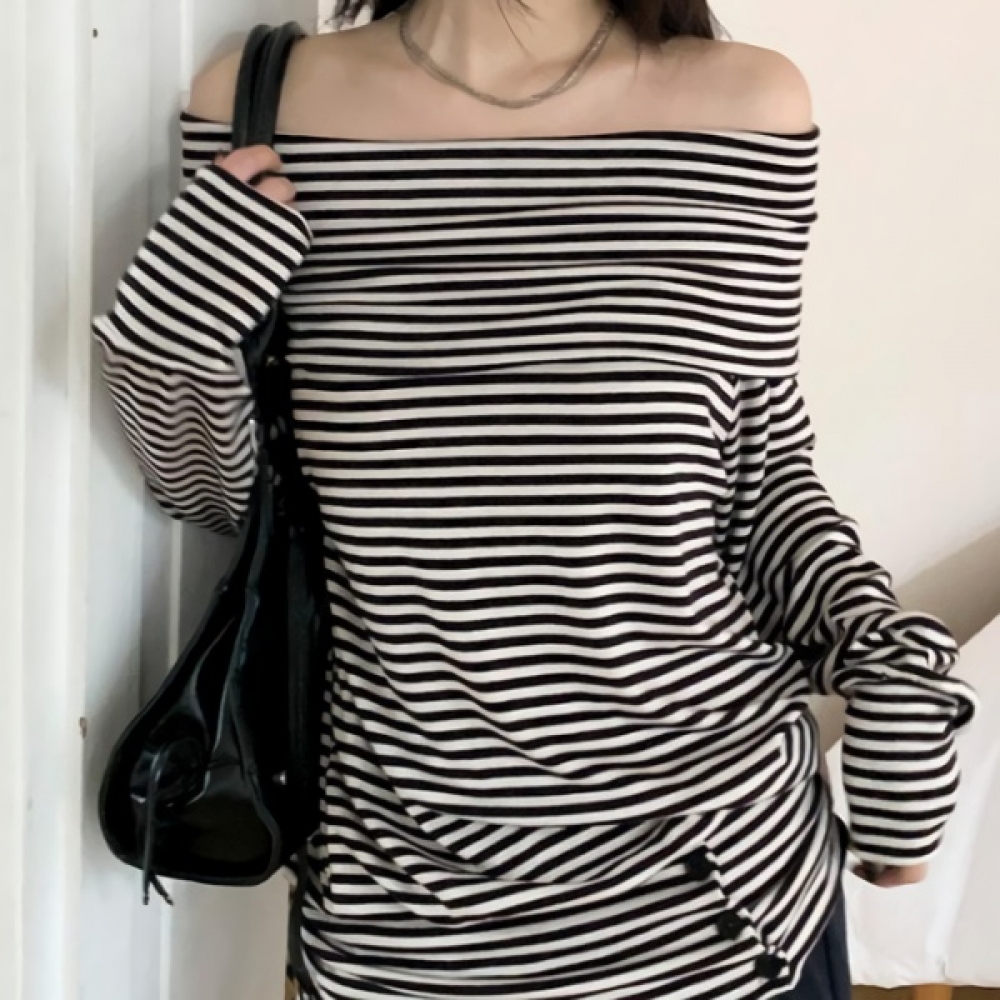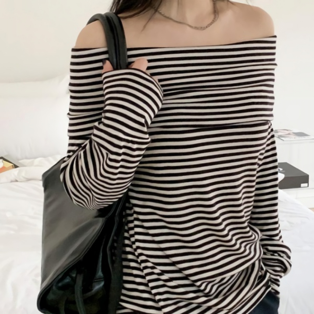 여성 스트라이프 루즈핏 오프숄더 맨투맨