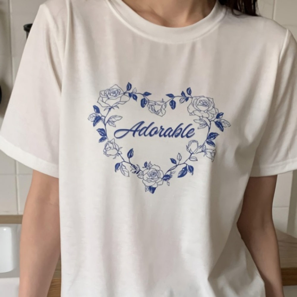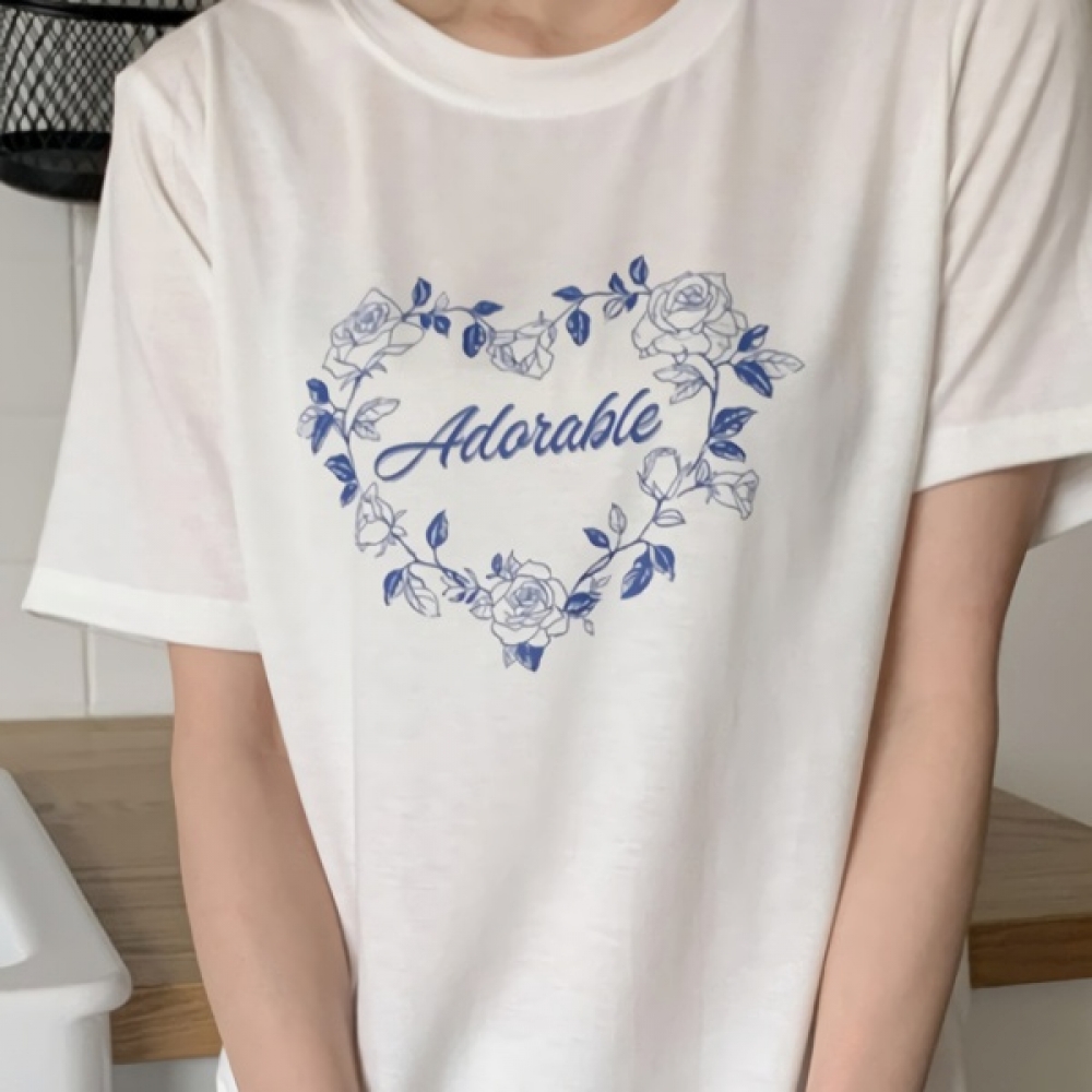 여성 하트 플라워 프린팅 베이직 반팔 티셔츠