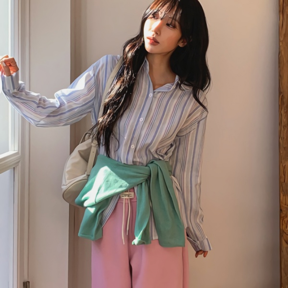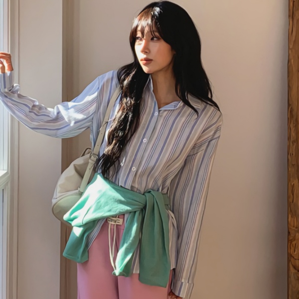 여성 오버핏 컬러 스트라이프 카라 셔츠