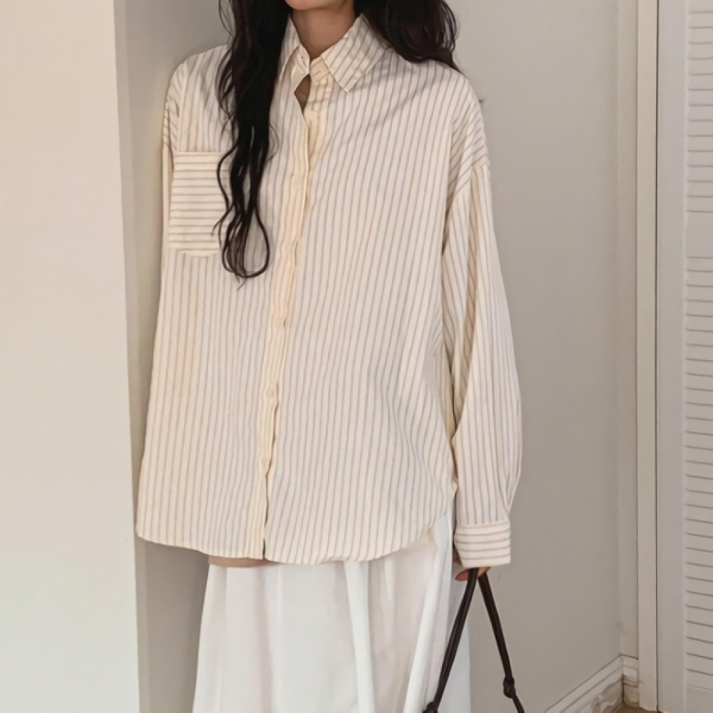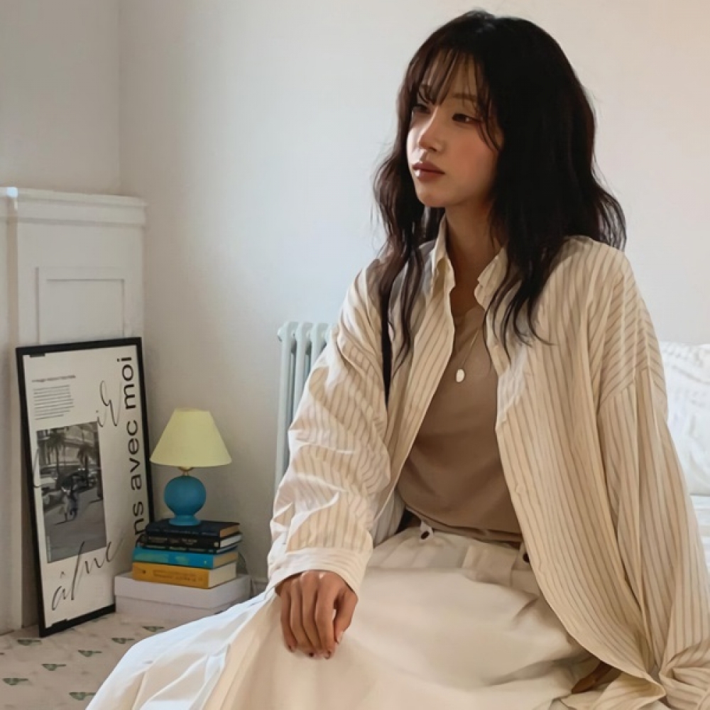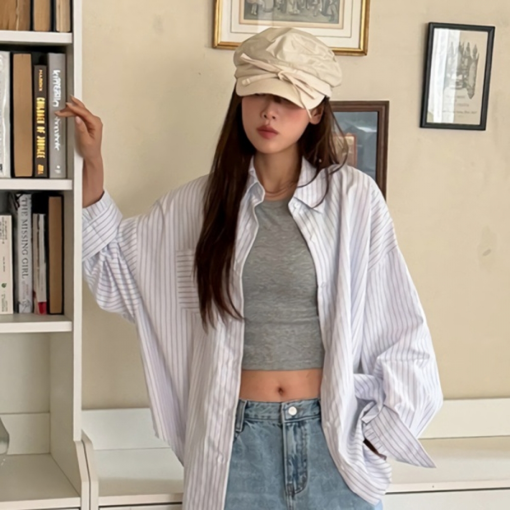 여성 탄탄 오버핏 스트라이프 카라 셔츠