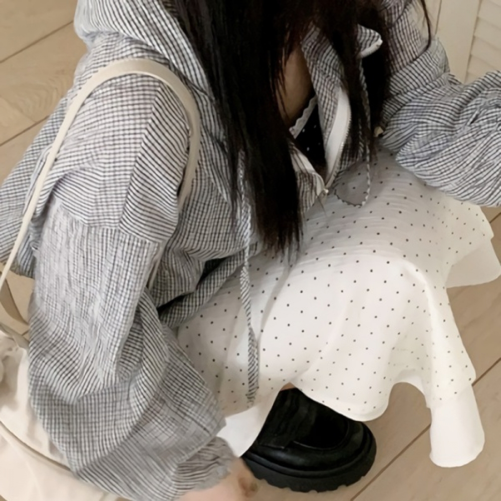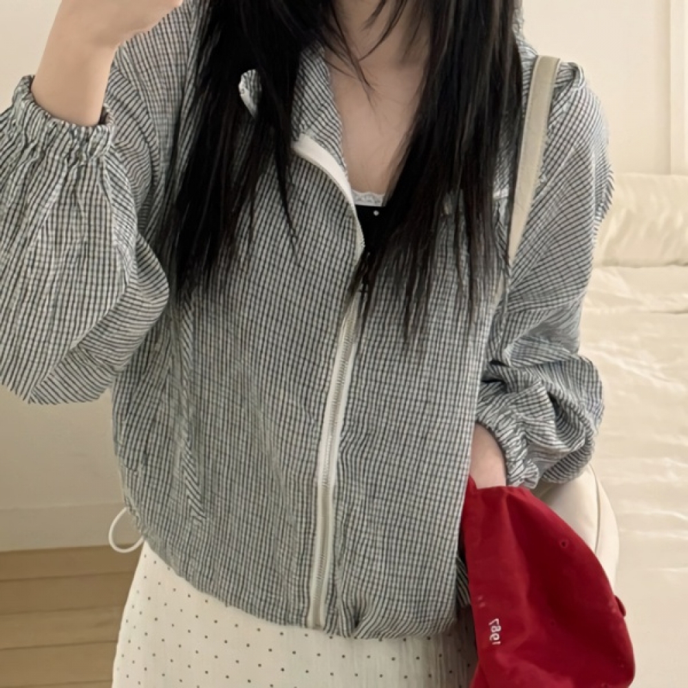 여성 봄 여름 체크 후드 집업 윈드 자켓