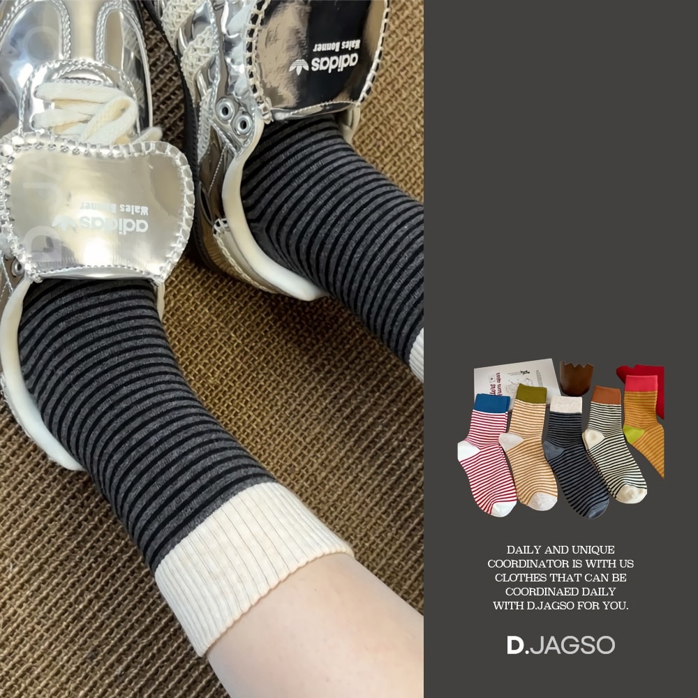여성 스트라이프 포인트 배색 양말 미디엄 길이
