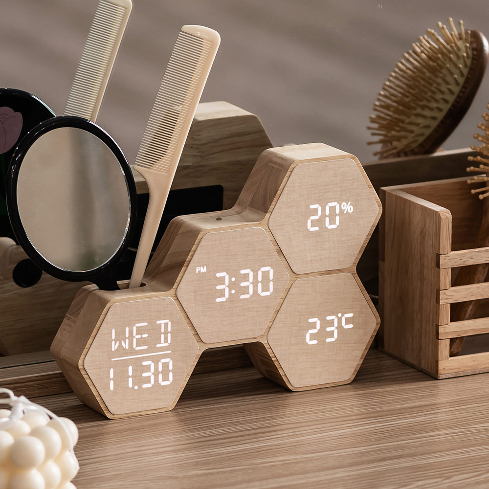 베이지브라운 허니콤 우드 인테리어 LED 탁상시계