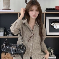 여성 허리 스트랩 포켓 롱 체크 셔츠