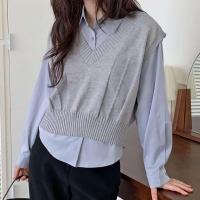 여성 브이넥 크롭 니트 조끼 베이직 셔츠 세트