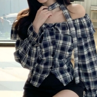 여성 초커 스트랩 오프숄더 체크 블라우스