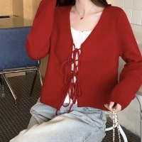 여성 봄 데일리 레드 스트링 크롭 가디건