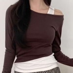 여성 언발 배색 레이어드 보트넥 티셔츠