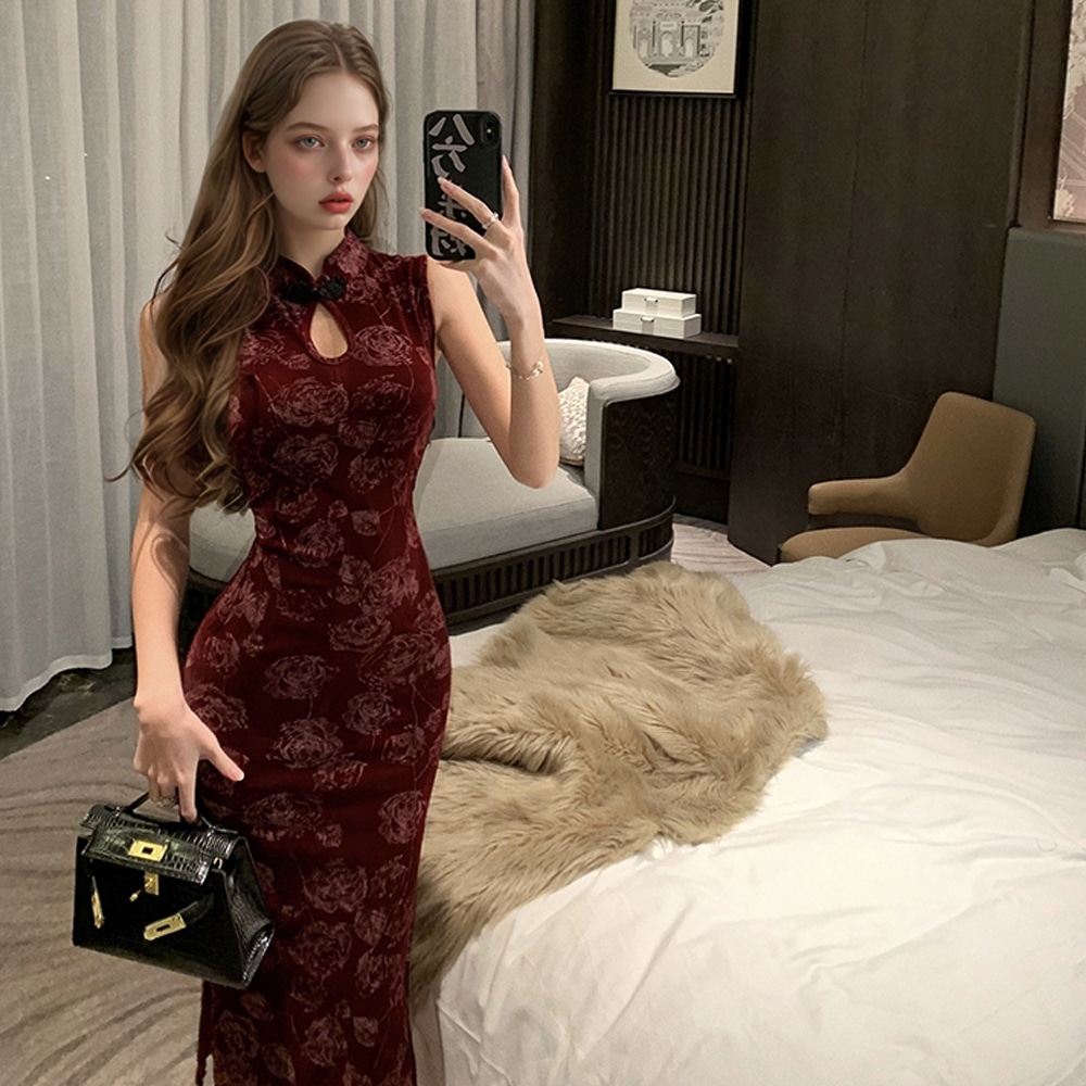 (대여) 레드 로즈패턴 키홀 벨벳 치파오 원피스 교복