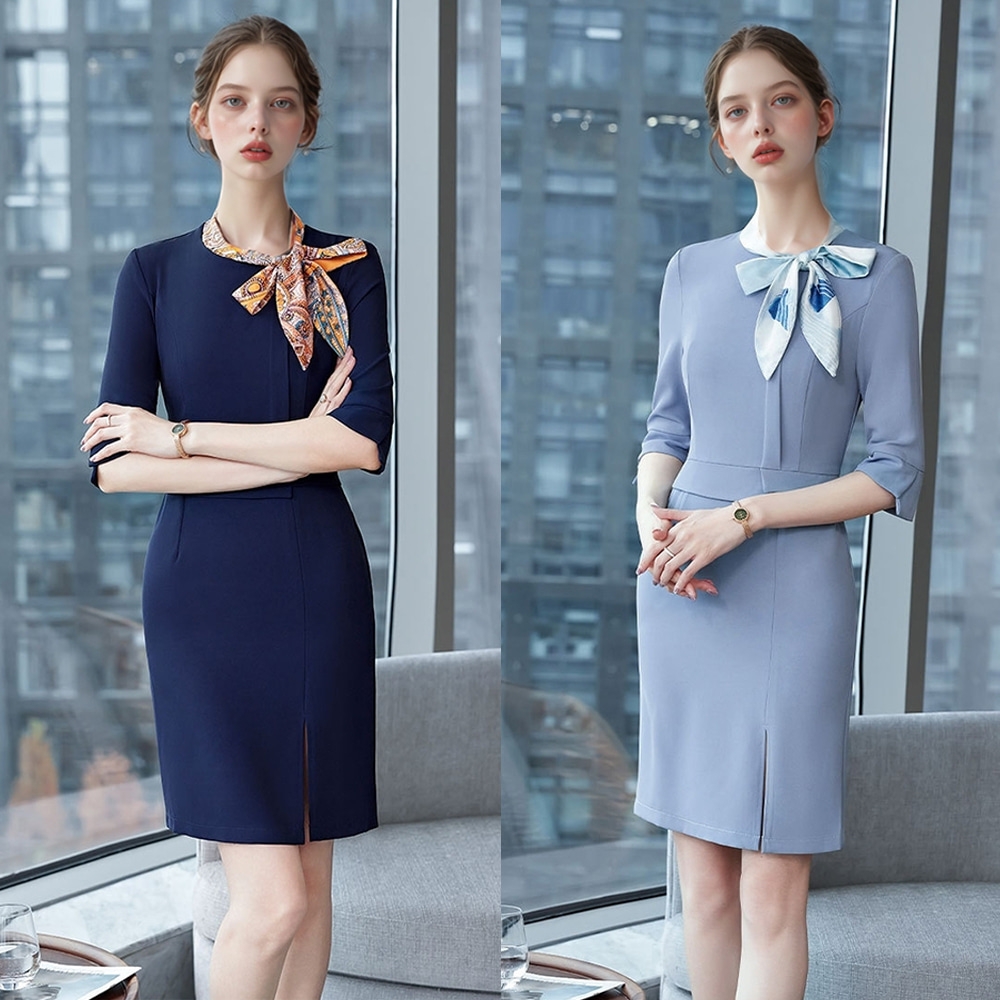 오피스 리셉션 패턴 스카프 슬림핏 H라인 원피스