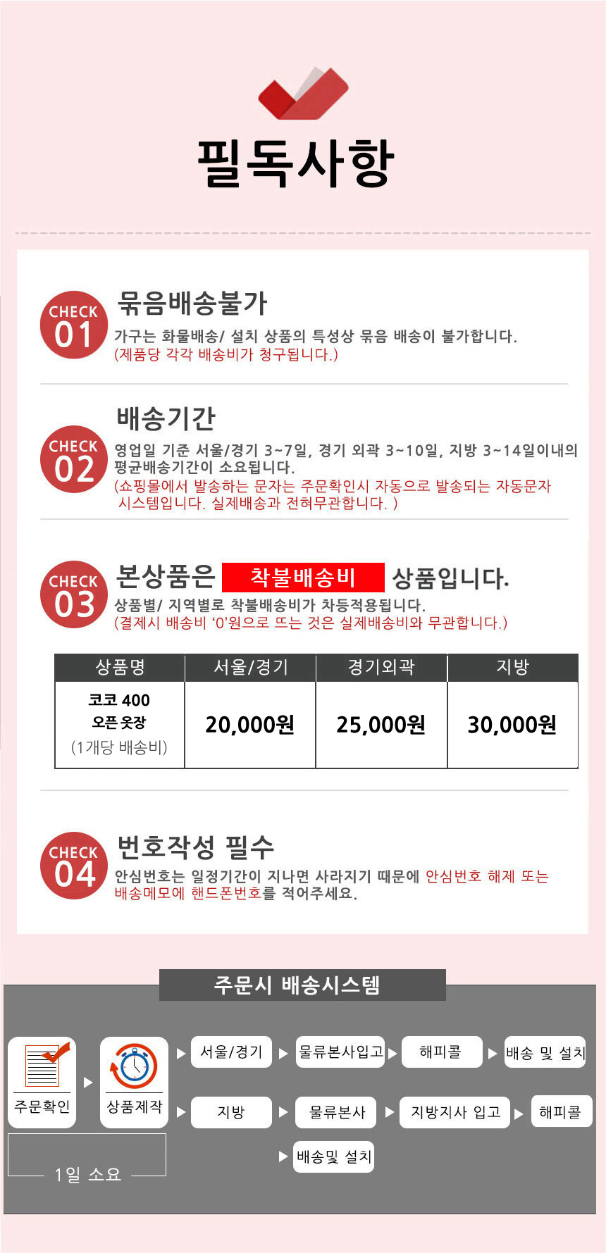 배송알림 상품별, 지역별로 배송비가 차등적용되오니 상세페이지를 꼭 확인해 주세요.